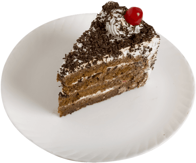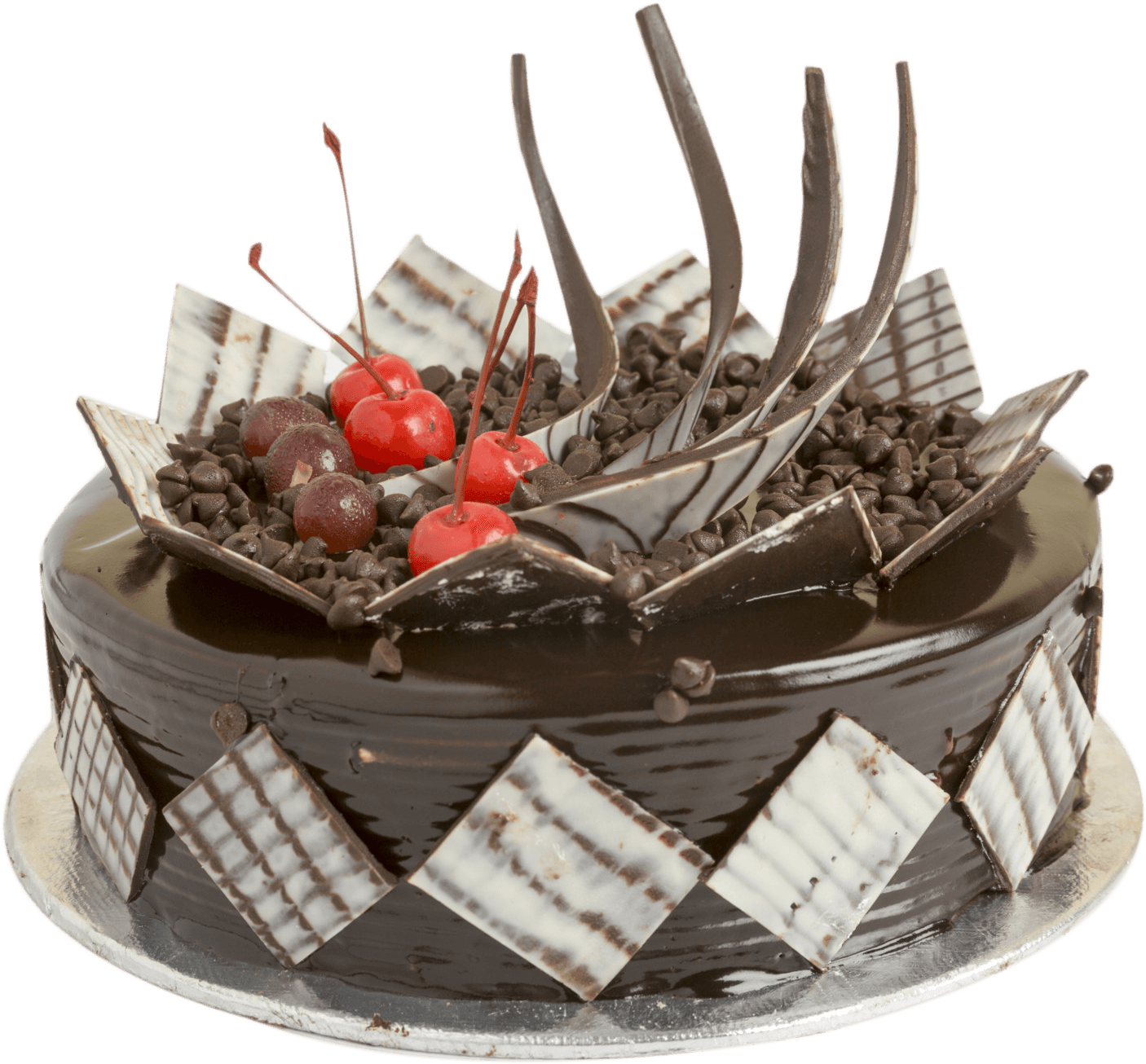 Our most luxurious dark chocolate cake with a dazzling dark chocolate mirror glaze, adorned with hand-designed white chocolate pieces, a chocolate fascinator, bittersweet chips, and cherries.